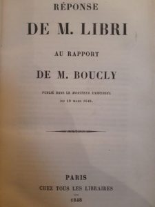 - LIBRI (G.). Réponse au Rapport de M. Boucly, publié dans le Moniteur universel du 19 mars 1848. Paris, Chez tous les libraires, 1848.