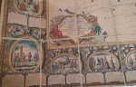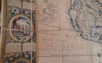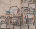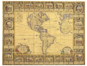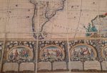 Rare carte murale entourée d'une superbe bordure dans le style Rococo, constituée de 20 scènes retraçant les événements cruciaux ayant trait à l'exploration et la découverte de l'Amérique : Découverte de l'Amérique, Conquête de l'Empire du Mexique, Découverte du Détroit de Magellan...