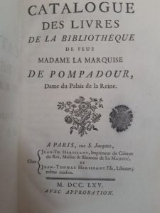 CATALOGUE DE VENTE. - Catalogue des livres de la bibliothèque de feue Madame la marquise de Pompadour, Dame du palais de la Reine. Paris, Jean-Thomas Hérissant, 1765. In-8, veau moucheté, dos lisse orné, pièce de titre bleue, tranches rouges (Reliure de l'époque).