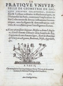 Dans son traité de géométrie, Jacques Chauvet, mathématicien champenois qui vécut au XVIe siècle et qui professa à l'université de Paris, expose sa méthode pour mesurer la longueur de toutes Lines [sic], Superficies, Soliditez, Cercles, Circonférences, Ciel, Terre, Mer & toutes autres choses que l'on peut veoir au moyen d'un instrument de son invention, le cosmomètre.