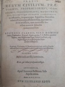 Praxis rerum civilium, praetoribus, propraetoribus, consulibus, proconsulibus, magistratibus id genus justituariis ac officiariis... Anvers, Jean Bellère, 1567. In-4, basane granitée, dos orné, tranches mouchetées de rouge (Reliure du XVIIe siècle).