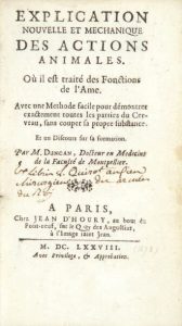 Le médecin Daniel Duncan (1650-1735), natif de Montauban et issu d'une famille protestante écossaise, propose ici une neurophysiologie mécaniciste de la motricité et des perceptions différente de celle de Descartes (cf. Olivier Walusinski, «Daniel Duncan ou le cerveau machine, un aperçu des neurosciences au XVIIe siècle» in Histoire des sciences médicales, 2018).