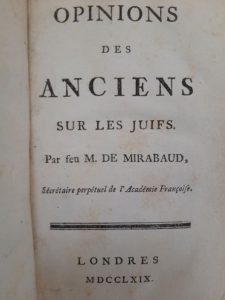 Opinions des Anciens sur les Juifs. Par feu M. de Mirabaud. Londres, 1769. In-12, veau, dos lisse orné, pièce de titre de maroquin rouge (Reliure de l'époque).