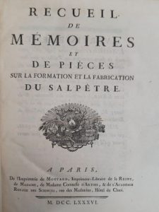 - Recueil de mémoires et de pièces sur la formation et la fabrication du salpêtre. Paris, De l'Imprimerie de Moutard, 1786. In-4, basane marbrée, dos orné de filets dorés, pièce de titre rouge, tranches mouchetées de bleu (Reliure de l'époque).