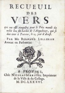 Recueil de vers de Bernard Lelleron (ou Lélleron), poète de Provins qui fut avocat au Parlement de Paris, composés à l'occasion du grand jeu de l'arquebuse qui se tint à Provins en 1686.