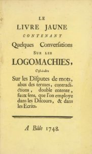 Livre jaune (le) contenant quelques conversations sur les Logomachies, c'est-à-dire sur les disputes de mots, abus des termes, contradictions, double entente, faux sens, que l'on employe dans les Discours, & dans les Ecrits. Bâle, 1748. In-8, cartonnage de papier jaune (Reliure postérieure).