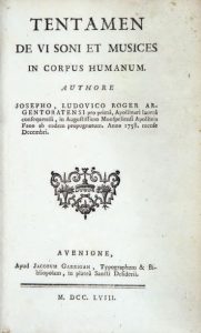 Excellente thèse sur la musique curative et ses effets sur le corps humain, l'un des premiers ouvrages de «musicothérapie», œuvre de Joseph-Louis Roger, médecin né à Strasbourg et mort à Avignon en 1761.