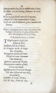 Le poème de Ronsard, Chant triomphal pour joüer sur la lyre : Sur l'insigne victoire qu'il a pleu à Dieu donner à Monseigneur frere du Roy (pp. 25-29), fut composé au lendemain de la retentissante bataille de Jarnac (13 mars 1569), où Coligny fut battu et Louis de Condé assassiné : C'est un hymne de victoire et une action de grâces d'un rythme sautillant, où le poète exulte, mû par des sentiments de patriotisme et de loyalisme [...] : car de bon cœur, il déteste les huguenots, qui ont si souvent troublé sa quiétude et même menacé sa vie (Paul Laumonier, Ronsard poète lyrique, p. 233). Cette pièce avait déjà paru en 1569 dans le Sixiesme livre des poèmes ronsardiens (Paris, Jean Dallier, f. 18).