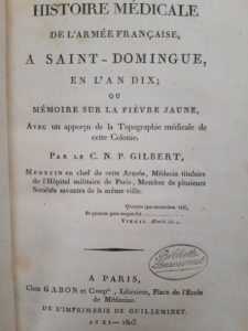- GILBERT (Nicolas-Pierre). Histoire médicale de l'armée française, à Saint-Domingue, en l'an dix ; ou Mémoire sur la fièvre jaune, avec un apperçu [sic] de la Topographie médicale de cette Colonie. Paris, Gabon et Compie, De l'Imprimerie de Guilleminet, An XI - 1803. In-8, demi-maroquin vert foncé avec coins de vélin ivoire, plats recouverts de papier à la colle rose, dos lisse orné de filets dorés et portant le titre, tranches mouchetées de rouge (Reliure moderne dans le goût ancien).