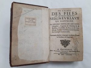 De l'usage des fiefs et autres droits seigneuriaux en Dauphiné. Contenant plusieurs remarques incidentes servans à l'Histoire de Dauphiné. Grenoble, François Féronce, 1664. In-12, basane granitée, dos orné, fleur de lis dorée répétée dans les caissons, tranches mouchetées de rouge (Reliure de l'époque).