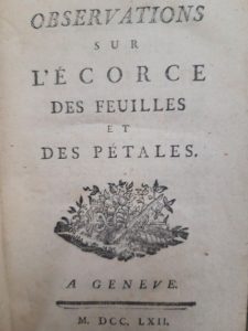 Observations sur l'écorce des feuilles et des pétales. Genève, 1762. In-12, cartonnage papier marbré, tranches marbrées (Reliure de l'époque).