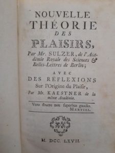 Nouvelle théorie des plaisirs, avec des réflexions sur l'origine du plaisir, par M. Kaestner. S.l.n.n., 1767. In-12, veau marbré, dos orné, pièce de titre rouge, tranches rouges (Reliure de l'époque).