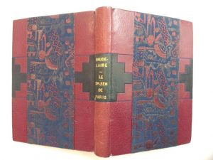 Le Spleen de Paris. Paris, À l'Enseigne du Pot cassé, collection Scripta Manent sous la direction de Constantin Castéra, 1925. In-8, maroquin lie de vin mosaïqué de bleu, bande de tissu sur les deux plats, dos titré, couverture et dos, étui.