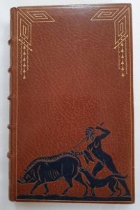 Charmante reliure de l'époque, illustrée d'un décor mosaïqué de maroquin noir, homme et son chien chassant un sanglier, dessiné à la manière antique.