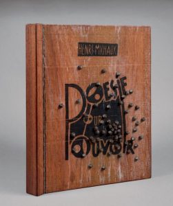 Poésie pour pouvoir. Paris, René Drouin, 1949. In-folio, en feuilles, couverture illustrée, chemise-couverture en bois de tek, premier plat titré, illustré et recouvert de clous à galoches, sous chemise titrée, et étui.