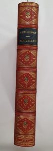 Nouvelles. Paris, L. Conquet, 1887. In-8, maroquin orange avec coins, filet doré, dos orné avec une fleur mosaïquée, tête dorée, couverture et dos (V. Champs).