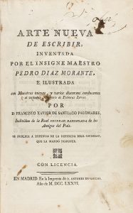 .1776.. LIBRO: .(CALIGRAFÍA).. .SANTIAGO PALOMARES, FRANCISCO:. .ARTE NUEVA DE ESCRIBIR INVENTADA POR EL MAESTRO PEDRO DIAZ MORANTE.. Madrid: Imp. de Antonio de Sancha, 1776. Folio. Portada + XXVIII + 136 p. + 2ª portada + 40 lám. grabadas al...