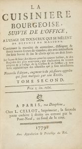 .1779.. LIBRO: .(GASTRONOMÍA).. .LA CUISINIERE BOURGEOISE SUIVIE DE L´OFFICE, A L´USAGE DE TOUS CEUX QUI SE MÊLENT DE DEPENSES DE MAISONS. TOME SECOND.. Paris: Imp. L. Cellot, 1779. 8º. 1 h. + 400 p. Algún punto de óxido. Enc. en pasta...
