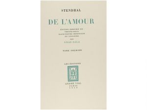 1952. (BIBLIOFILIA). STENDHAL; GRAU SALA [ilustrador:]: DE L'AMOUR. Paris: André Vial, 1952. 2 vol. en 4° menor. 250 p. cada vol. Ejemplares en rama con cubiertas y estuche en cartoné. Ilustraciones de GRAU SALA.