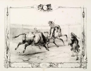 Combats de taureau. Douze sujets dessinés d'après nature - Corrida de toros. Paris, Bulla & Aumont, [ca 1830]. Un album in-folio oblong, demi-chagrin prune de l’époque, titre frappé à l'or sur le premier plat. Titre gravé et 12 grandes lithographies tauromachiques en noir. Victor Adam (Paris 1801-1866), fit ses premiers travaux lithographiques en 1824,et,cette suite une dizaine d'années après chez l'imprimeur Lemercier, Bonnard et Cie ; les estampes correspondent à la série de Carnicero bien que sa technique lithographique dénote une plus grande agilité dans le dessin et qu'un ingénieux encadrement rajouté par l'artiste fasse ressortir les estampes. El siglo de oro de las tauromaquias. Estampas taurinas p. 96. Knitter 156 Pertus 18.  Dos très frotté, coiffes arrachées. Mais très bon état intérieur. Ex-libris armorié à tête de licorne, contrecollé sur le plat intérieur (comte de Beaufort). Ex-libris héraldique de Schwerdt. cf. Souhart 501.