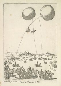 Fiesta de toros en el aire[Madrid ?], sans éditeur, 1784.. Eau-forte gravée sur cuivre (21 x 31 cm, à la cuvette), dans un beau cadre doré (copie moderne de cadre ancien).. Cette planche dessinée et gravée par Carnicero représente une scène de picador en ballon !. Elle provient de la collection Knitter ;elle est reproduite dans El Siglo de Oro de las Tauromaquias, p. 33. Elle figure aussi au musée taurin de Madrid..
