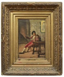 Après la Corrida : torero alangui buvant du rioja pour fêter son succès. [Barcelona ?], [c.1880].. Belle peinture à l'huile sur toile richement encadrée au XIXe siècle. Cadre en bois doré de 53 x 61 cm. qq. accidents. Signée .H. Daunas en haut à droiteLa scène se situe dans un couloir des arènes devant une table espagnole sur laquelle se trouvent une bouteille de rioja et un verre. Un cartel tauromachique est affiché en arrière plan.. Daunas (1843-1903), qui fait partie de l’école espagnole, a surtout exécuté des ?uvres de genre dans lesquelles figurent parfois des toreros. Il a surtout exposé à Paris. Benezit, III, 379.. Belle oeuvre d'une très bonne facture..
