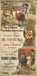 Portrait en pied de Fernando Gomez (El Gallo).. Madrid, J. Palacios, 1890.. Belle affiche chromolithographiée. 60 x 80 cm. Elle est encadrée sobrement. Bon état malgré quelques traces de pliures.. Extraite de la Lidia. Elle représente un des toreros les plus célèbres de l'époque : Gallito (1847-1897) patriarche de la dynastie Gallo,considéré comme l'un des premiers à avoir son propre timbre artistique.Ce fin torero possédait un grand répertoire.. La revue tauromachique La Lidia a paru du 18/10 / 1874 au 02/08/1897..