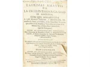 1701. (BARCELONA). LAGRIMAS AMANTES DE LA EXCELENTISSIMA CIUDAD DE BARCELONA (...) EN LAS MAGNIFICAS EXEQUIAS, QUE CELEBRO A LAS AMADAS, Y VENERABLES MEMORIAS DE SU DIFUNTO REY Y SENOR DON CARLOS II. Barcelona: en la Imprenta de Ivan Pablo Marti, por...
