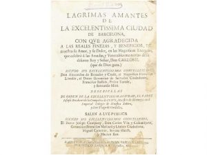 1701. (BARCELONA). LAGRIMAS AMANTES DE LA EXCELENTISSIMA CIUDAD DE BARCELONA (...) EN LAS MAGNIFICAS EXEQUIAS, QUE CELEBRO A LAS AMADAS, Y VENERABLES MEMORIAS DE SU DIFUNTO REY Y SENOR DON CARLOS II. Barcelona: en la Imprenta de Ivan Pablo Marti, por...