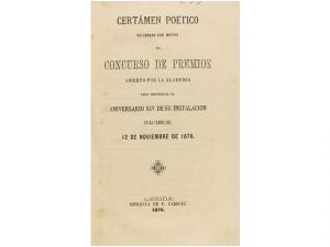 1876. (MALAGA-LLERIDA). CERTAMEN POETICO DEDICADO A NTRA. SENORA DE LA VICTORIA DE MALAGA. Lerida: Imp. de Carruez, 1877. 4° menor. 237 p., 2 h. Enc. reciente el tela. Ex-libris.