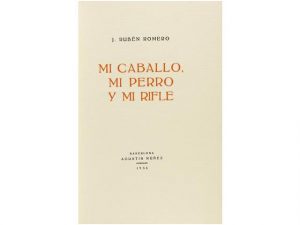 1936. (DEDICATORIA A COMPANYS-CAZA). ROMERO, RUBEN: MI CABALLO, MI PERRO Y MI RIFLE. Barcelona: Agustin Núnez, 1936. 4° menor. 246 p. Papel verjurado con barbas. Enc. en plena piel, nervios, lomo cuajado. Hilos dorados y hierros en los planos....