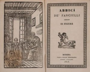 de fanciulli. Modena, Soliani, 1815. In-12, broché. Charmant petit abécédaire italien orné de 9 gravures sur bois et de 14 planches d'alphabet.