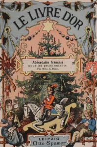 Le Livre d’or I. Abécédaire français illustré pour les petits enfants. Leipzig, Otto Spamer, s.d. [vers 1870]. In-8, percaline rouge, illustration polychrome et dorée sur le plat supérieur (Reliure de l’éditeur). Douzième édition, ornée d’un titre et d’un frontispice en couleurs et de 300 vignettes en noir.