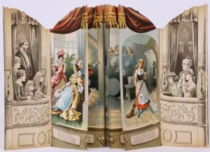 Le livre s'ouvre par le milieu et se transforme en théâtre, avec des balcons de chaque côté. Le lecteur se trouve ainsi placé dans l'avant-scène ou proscaenium du théâtre dont les scènes changent au fil des pages qui se tournent.