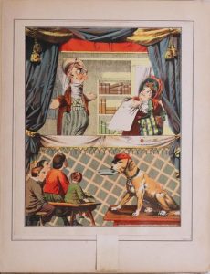 des Marionnettes. Les méfaits de Gaspard. Drame comique en 6 actes et 6 tableaux. Paris, Guérin-Müller, s.d. [vers 1900]. In-4, cartonnage illustré de l'éditeur. Ouvrage orné de 6 planches en couleurs avec des parties mobiles actionnées par des tirettes.