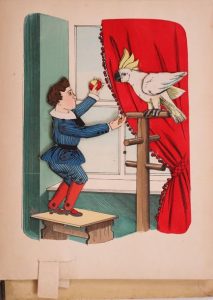 Lebende Bilder. München, Braun & Schneider, s.d. [vers 1880]. Ouvrage illustré de 8 amusants pop-up en couleurs de Lothar Meggendorfer. Il s'agit du premier livre à système inventé par l'illustrateur, à l'attention de son fils Adolf pour Noël.