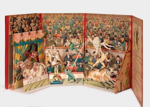 Internationaler Circus. Esslingen & München, Schreiber, s.d. [1887]. In-4 leporello, cartonnage illustré de l'éditeur, étui. Ouvrage considéré comme l'un des chef-d'oeuvres de Lothar Meggendorfer. Il est composé de 8 planches à systèmes illustrées en couleurs, dont 6 dépliantes. On y voit les différents spectacles de cirque, les gradins et les musiciens.