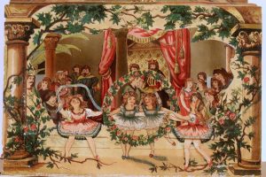 Quattro grandi teatri con attori mobili. Oggi si rappresenta pei bambini. Milano, Ulrico Hoepli, s.d. [vers 1900]. In-4, ff. cartonnés doubles reliés entre eux par des charnières de toile, les planches se repliant les unes sur les autres (Cartonnage de l'éditeur). Ouvrage illustré de 4 grandes planches à système en couleurs.