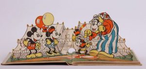 The Pop-Up Mickey Mouse. – The Pop-Up Minnie Mouse. New York, Blue Ribbon Books, s.d. [1933]. 2 volumes in-12 brochés, cartonnage illustré de l'éditeur. Éditions originales de ces albums réalisés par l'équipe Disney Studio et illustrés de vignettes en noir et de trois images animées pop-up à double page.
