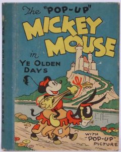 The "Pop-Up" Mickey Mouse in ye olden days. New York, Blue Ribbon, 1934. In-24, cartonnage illustré de l'éditeur. Édition originale contenant une image pop-up en couleurs en excellent état et des vignettes en noir.