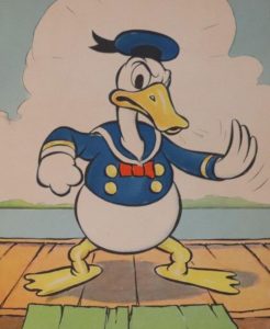 Donald Duck. Racine, Whitman Publishing Company, 1935. Plaquette in-folio agrafée, couverture en couleurs de l'éditeur. Édition originale du premier ouvrage avec Donald Duck comme héros, orné de grandes illustrations en couleurs.