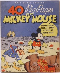 40 Big pages of Mickey Mouse. Racine, Whitman Publishing Company, 1936. Plaquette in-folio agrafée, couverture illustrée. Édition originale de ce rare album de Mickey, contenant des historiettes, des coloriages ou des jeux imprimés en noir et en couleurs.