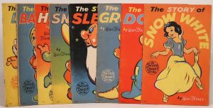 The seven dwarf books. Racine, Whitman Publishing Company, 1938. 8 volumes in-8, agrafés, étui illustré de l'éditeur. Set complet des 8 aventures illustrées de Blanche-Neige et des 7 nains.
