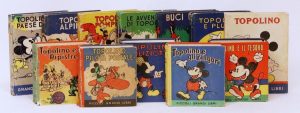 On joint chez le même éditeur 5 volumes in-24 en cartonnage d'éditeur : Topolino e gli Zingari. 1935. – Topoliono poliziotto. 1936. – Topolino pilota postale. 1935. – Topolino e Pipistrello. 1936. – Topolino e il tesoro. 1937. Rousseurs.
