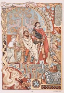 Histoire des quatre fils Aymon, très Nobles et très Vaillans Chevaliers. Paris, H. Launette, 1883. In-4, demi-maroquin rouge avec coins, tête dorée, couverture (Reliure de l'époque). Édition ornée à chaque page de compositions en couleurs d'Eugène Grasset, gravées par Charles Gillot. Il s'agit du premier livre imprimé grâce au nouveau procédé de photogravure et chromographie inventé par Charles Gillot. Cet ouvrage fut reconnu tardivement comme précurseur et annonciateur de l'Art nouveau.