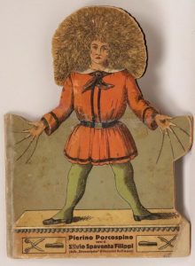 Ensemble 5 éditions illustrées du Struwwelpeter. Pierino Porcospino versi di Silvio Spaventa Filippi. Milano, Sperling & Kupfer Succ, s.d. In-4, broché, ouvrage en forme du personnage de Struwwelpeter (Cartonnage de l'éditeur). Adaptation italienne de l'ouvrage allemand. Réparations au scotch, couleurs effacées dans les angles et le dos.