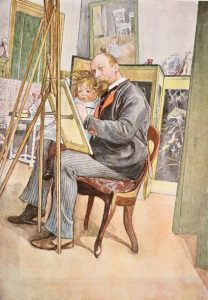 Larssons. Stockholm, Albert Bonniers, s.d. [1902]. In-4, percaline verte illustrée en noir et doré de l'éditeur. Édition originale illustrée de 32 planches en couleurs de Carl Larsson.