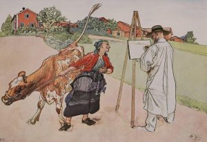 Spadarfvet mitt Lilla Landtbruk. Stockholm, Albert Bonniers, 1906. In-4 oblong, demi-percaline verte avec coins de l'éditeur, fer doré au centre. Ouvrage orné de 24 illustrations en couleurs de Carl Larsson.