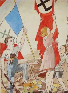 La France sinistrée. La France libérée. École communale de jeunes filles, 5 rue de Torcy, Paris 18e. [Vers 1945-1950]. Ouvrage unique orné de 8 dessins originaux au crayon et à la gouache réalisés par des jeunes filles de l'école communale de Torcy, âgées de 12 à 14 ans.