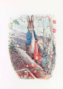 The Tale of Benjamin Bunny. London and New York, Frederick Warne & Co, 1904. In-24, cartonnage gris illustré d'un petit lapin en couleurs, titre en vert (Reliure de l'éditeur). Édition originale et premier tirage, ornée de 27 illustrations en couleurs dont un frontispice de Beatrix Potter.